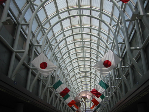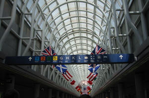 結局1時間弱待ってようやく離陸。でもこの後がすごかった。普通NYからシカゴへは2時間ほど掛かるのだが、なんと1時間半で到着。やれば出来るじゃん。下の写真がシカゴ空港の写真。国際空港だけあって、いろんな国旗が並んでいます。