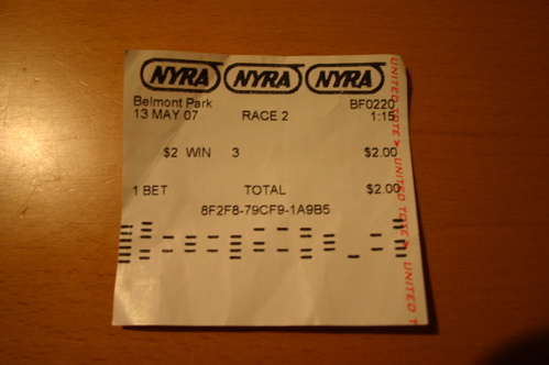 第一レースを終えて要領がつかめた。そこで第二レースを買う事にした。本当に勝てるか半信半疑だったので試しに2ドルだけ賭けてみた。下の写真にあるレシートが万馬券になるのでしょうか??