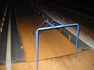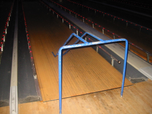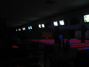 ありました。ありました。ボーリング場が。何レーンか貸し切り状態になっていて、誕生日会に招待された子供たちとその親で満杯。さらに照明が暗いんです。