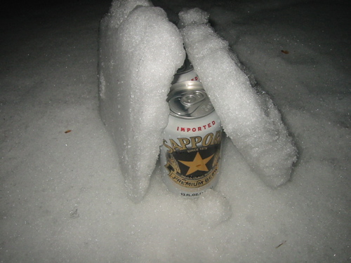 ここで妙案思いついた。外は天然の冷蔵庫。だったらどこまで実用出来るか試す事にした。NARAで買ったビールを雪の上においてみた。30分後、、キンキンに冷えていました。実験成功!。