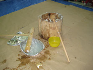 さてさて我が家が到着したら、ボランティアの父兄達が餅つきを開始していました。(我が家もボランティアを名乗っていたのですが、年始早々遅刻。何ちゅーこっちゃ。)