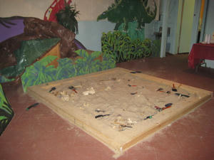 さて誕生日会最初のゲーム内容が会場係員から説明された。下の写真にある砂場に恐竜などの骨がいっぱい埋まっており、これを発掘するゲームだ。
