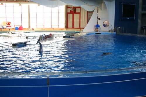 子供たちを担いで走って走って走って、ようやくイルカのショウ会場に着いた。下の写真がその様子。まあ普通のショウでした。