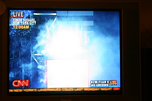 下の写真は年が変わった瞬間のテレビ画像。マンハッタンのタイムススクェアにくす玉が設置され、点火されて炸裂した瞬間を激写してしまいました。その後、リポーターが今年の抱負を聞いて回っている風景が放映され、どこの国も同じでんな。