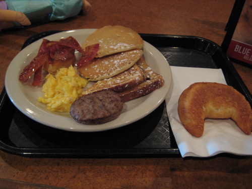 さて昨晩チェックインの時にもらった朝食券を握りしめて食堂へ。どんな朝ご飯かと思いきや、併設していたファミリーレストラン(Fridays)だった。バイキング形式で、こんなものを選んでみた。