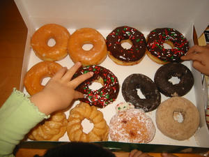 家に帰ると早速子供たちの手が「にゅー」とドーナッツに伸びてきた。私も負けじと食べる。