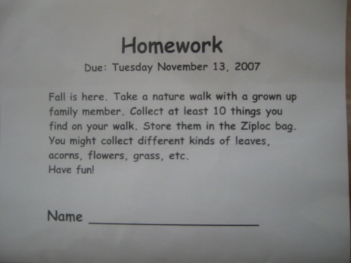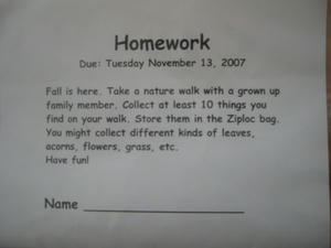 さてさて長女が学校からこんな宿題をもらってきていた。Ziploc bagに入っている紙を読んでみると秋らしいものを最低10個見つけて袋に入れるというもの。提出期限は明後日の11/13。えらいこっちゃ。